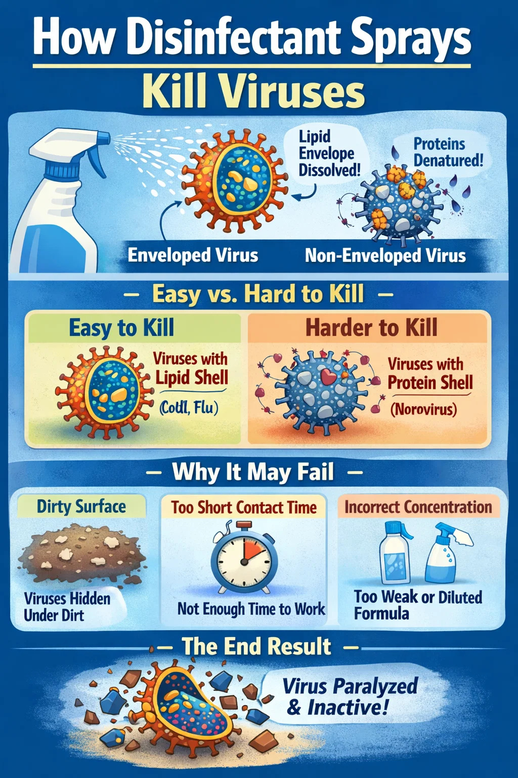 Az "összetevők" megzavarása: Egyes vírusok nem rendelkeznek lipidburokkal, de a permetben lévő kémiai komponensek (például oxidálószerek) közvetlenül megtámadhatják a vírus felületén lévő fehérjéket, amitől ezek a fehérjék denaturálódnak és összetapadnak, akár egy nyers tojás főzésekor. Miután a fehérjék megváltoztak, a vírus többé nem tud bejutni a sejtjeinkbe, mint egy kulcs, amely kinyitja a zárat.