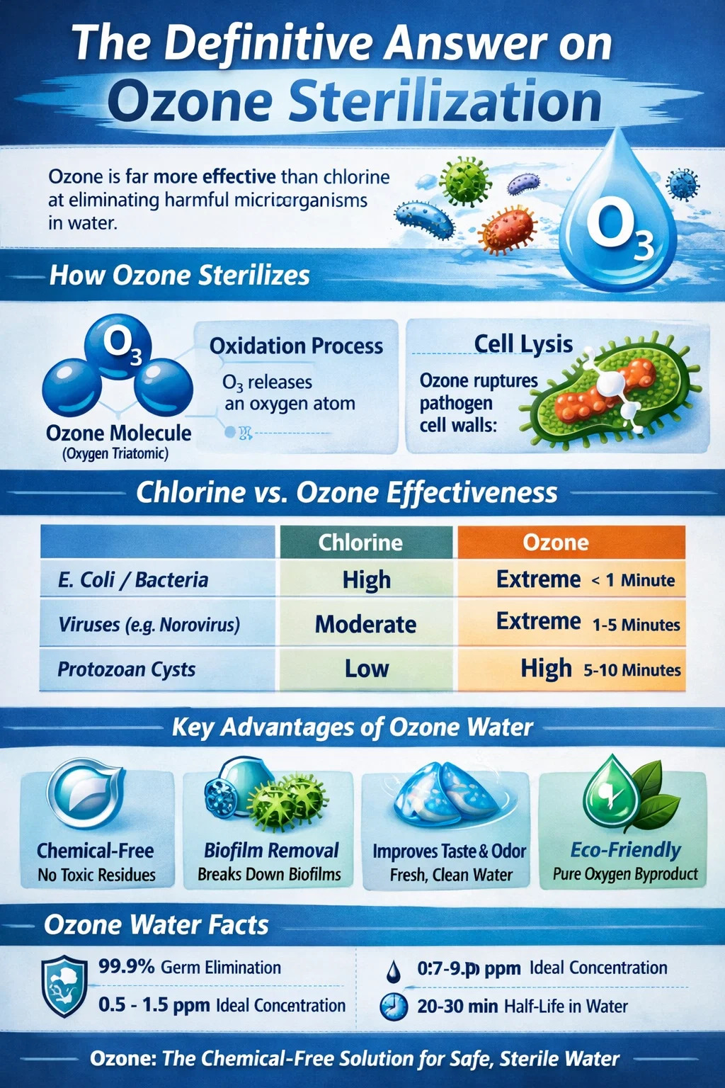 Összefoglalva, ózonos víz egy rendkívül kifinomult és hatékony eszköz a víz sterilizálásához. A sejtek fizikai, nem pedig kémiai elpusztítására való képessége elsődleges választássá teszi a kórházak, a palackozó üzemek és az egészségtudatos otthonok számára. Az érintkezési idő és a koncentráció egyensúlyának megértésével kihasználhatja az ózont biztonságos, steril és kristálytiszta vízellátás létrehozására egyetlen csepp kemény vegyszer nélkül.