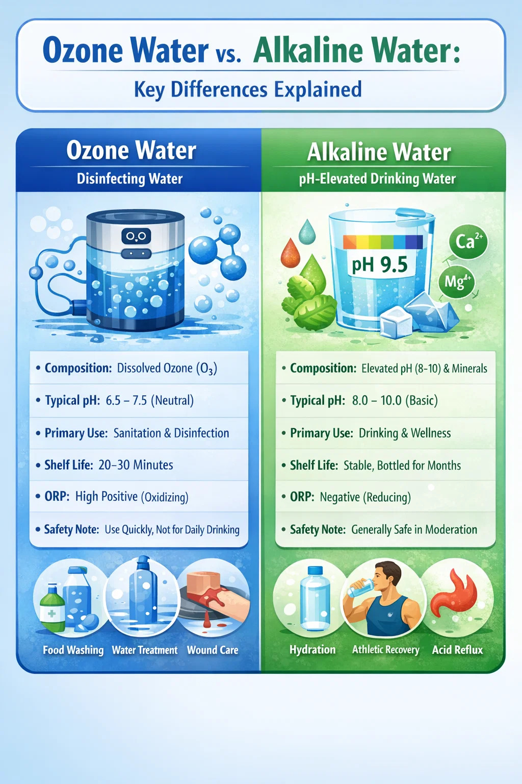 Az ózonos víz és a lúgos víz különálló termékek, eltérő kémiával, eltérő felhasználási lehetőséggel és különböző bizonyítékokkal. Az ózonos víz egy erős, rövid élettartamú fertőtlenítőszer, amely leginkább higiéniai feladatokhoz – élelmiszerek mosásához, felületek kezeléséhez és víztisztításhoz – használható. A lúgos víz egy emelt pH-értékű ivóvíztermék, amely szerény és máig vitatott előnyökkel jár a hidratációval és a savas reflux kezelésével kapcsolatban.